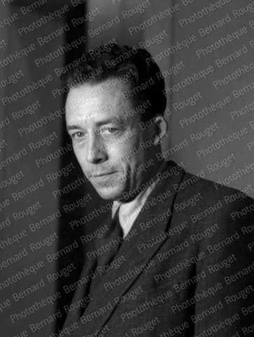 Albert Camus au théâtre Hébertot pendant la pièce de théatre Caligula avec Gérard Philippe, portrait recadré, novembre 1945.