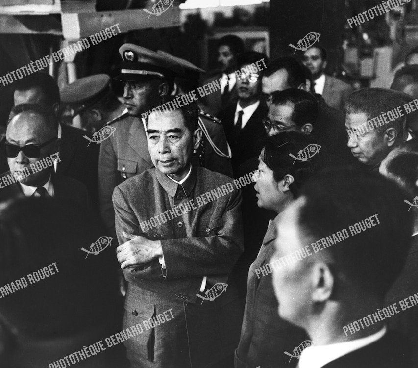 Premier ministre de la République Populaire de Chine, au Maroc lors de sa tournée au Moyen-Orient et en Afrique. Décembre 1963. A gauche le ministre chinois des Affaires étrangères Chen Yi.