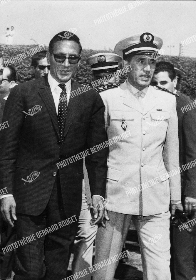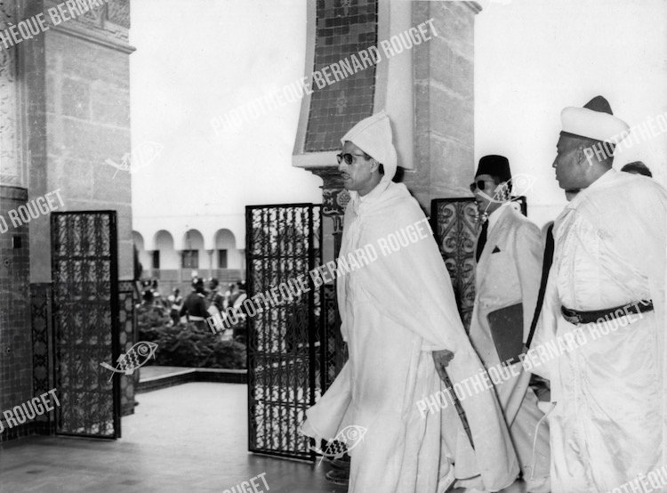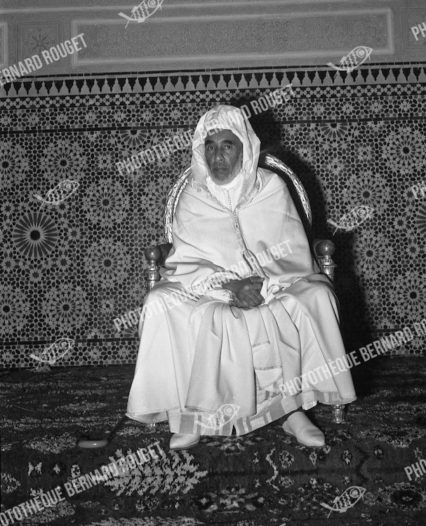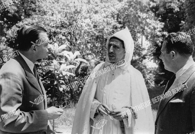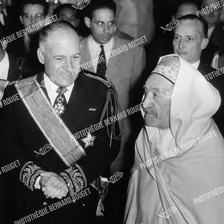 Thami El-Glaoui à gauche fait destituer le sultan Sidi Mohammed qui est remplacé par Arafa qui est ici à coté de lui. 20 août 1953