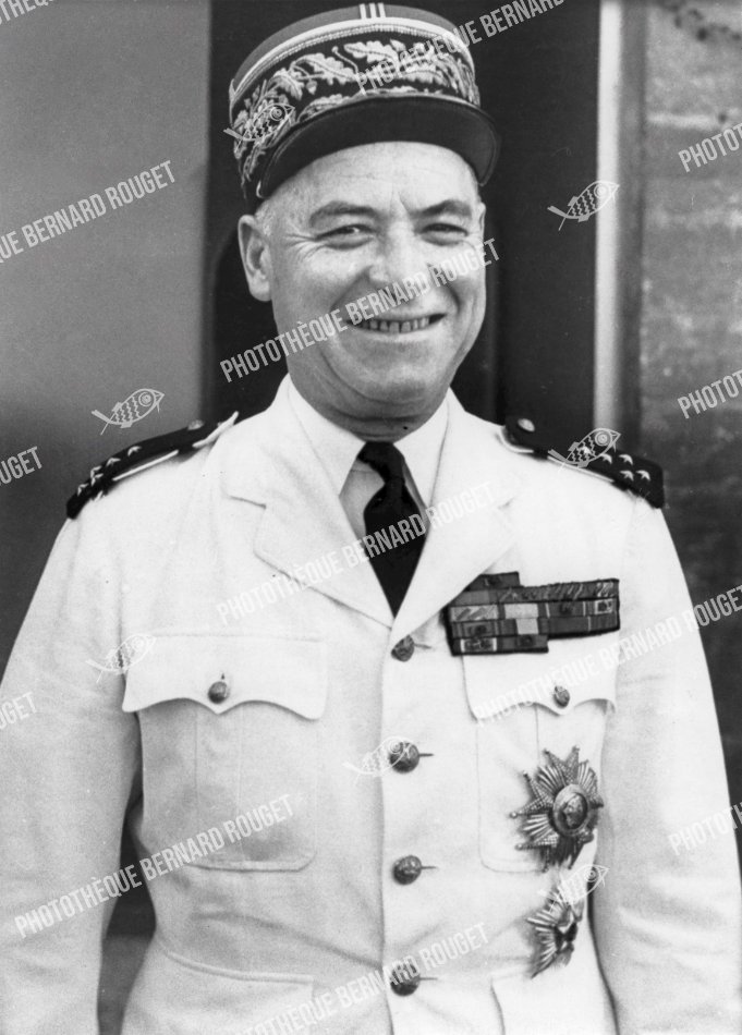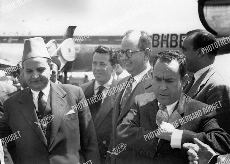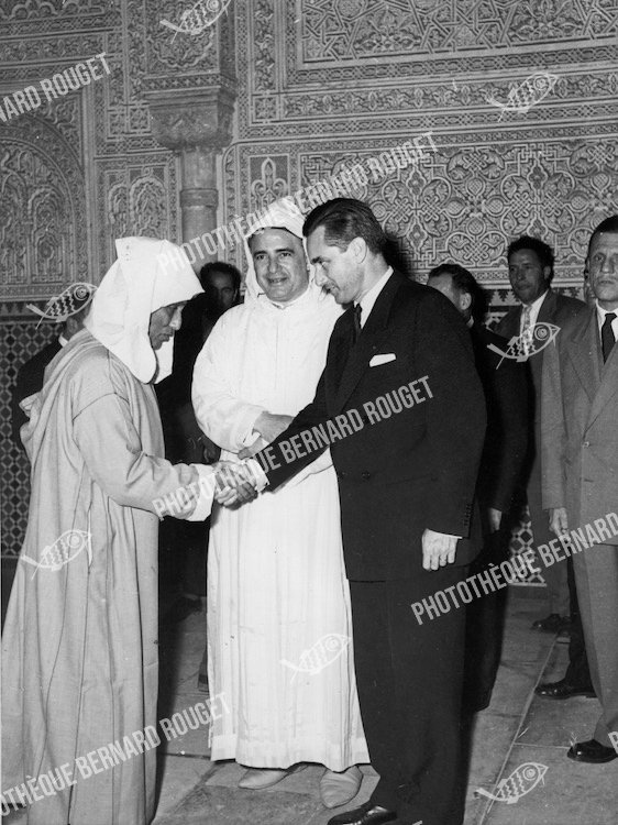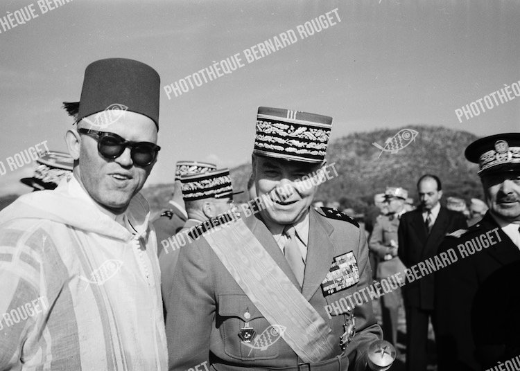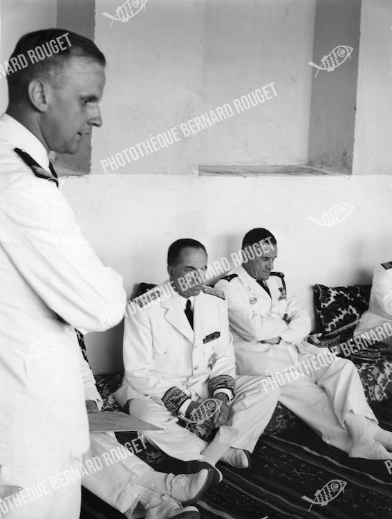 Le conseil du Trône enfin instauré ; Le général Boyer de Latour avec à sa gauche, le général Leblanc, de l'autre coté de gauche à droite si Bekkai Ould M'Barek, ancien pacha de Sefrou, Hadj Mohamed Sbihi pacha de Salé, le grand vizir Hadj Mohamed el Mokri, et le caïd Si Tahar Ouassou, le 15 octobre 1955